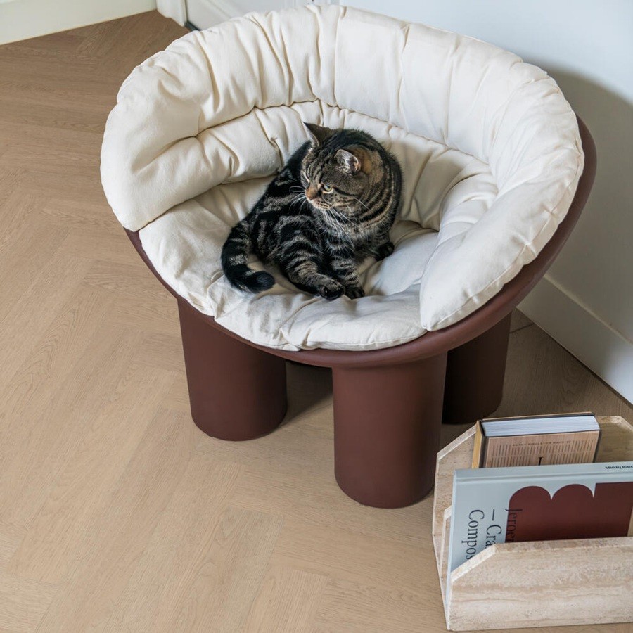 Het onderhoud van de Luna-visgraatvloer is eenvoudig en efficiënt. De gesloten, slijtvaste toplaag voorkomt dat vuil en vocht in het materiaal trekken, waardoor regelmatig stofzuigen en af en toe licht dweilen voldoende is om de vloer in topconditie te houden. Hierdoor is de vloer bijzonder geschikt voor gezinnen, huisdieren en drukbezochte ruimtes, waar praktisch onderhoud en hygiëne essentieel zijn.