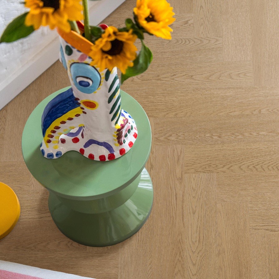BerryAlloc Spirit Soul Visgraat Gluedown Eliza is een premium eiken PVC-visgraatvloer met licht geborstelde houtnerven en een ultra matte afwerking in een medium warme en heldere kleur. De subtiele, minimale kleurvariaties in en tussen de planken zorgen voor een rustige en elegante uitstraling, perfect passend in moderne, klassieke of Scandinavische interieurs. Dankzij de duurzame PVC-opbouw is de vloer slijtvast, onderhoudsvriendelijk en geschikt voor intensief gebruik. Het visgraatpatroon voegt een tijdloze en verfijnde touch toe aan elke ruimte, waardoor Eliza een stijlvolle en functionele keuze is voor zowel residentiële als projectmatige toepassingen.