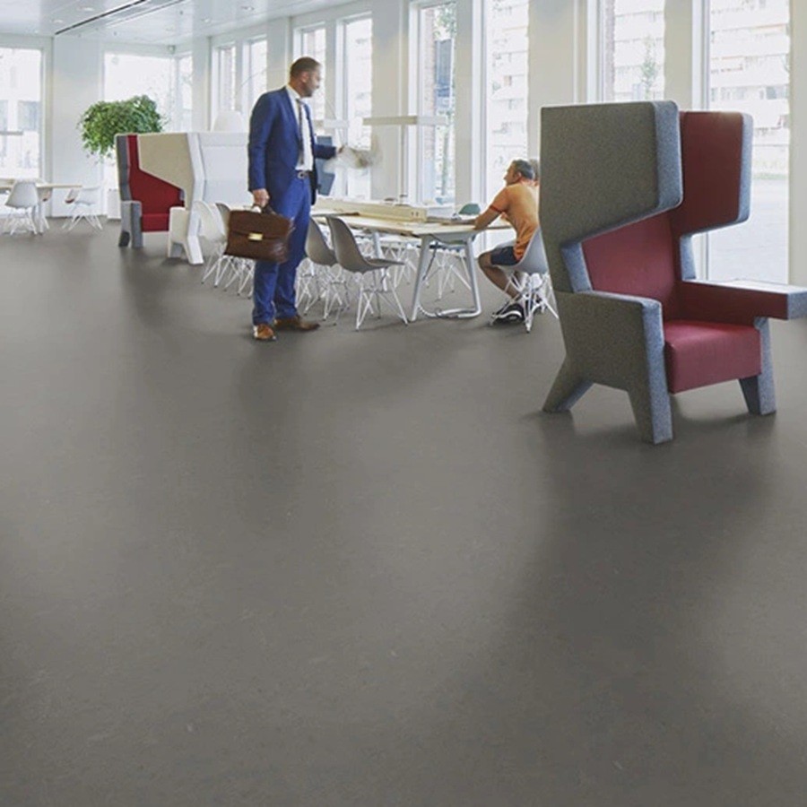 Een opvallend visueel kenmerk van deze vloer is het ontbreken van een V-groef. Dit zorgt voor een strak en naadloos oppervlak dat een rustige, moderne en elegante uitstraling geeft. Het ontbreken van zichtbare naden betekent dat vuil en stof zich minder snel ophopen, waardoor de vloer eenvoudig schoon te houden is. In combinatie met de natuurlijke antibacteriële eigenschappen van linoleum biedt deze vloer een hygiënische en onderhoudsvriendelijke oplossing. Dit is een groot voordeel voor gezinnen met kinderen, huisdieren of lichte commerciële ruimtes waar hygiëne belangrijk is.