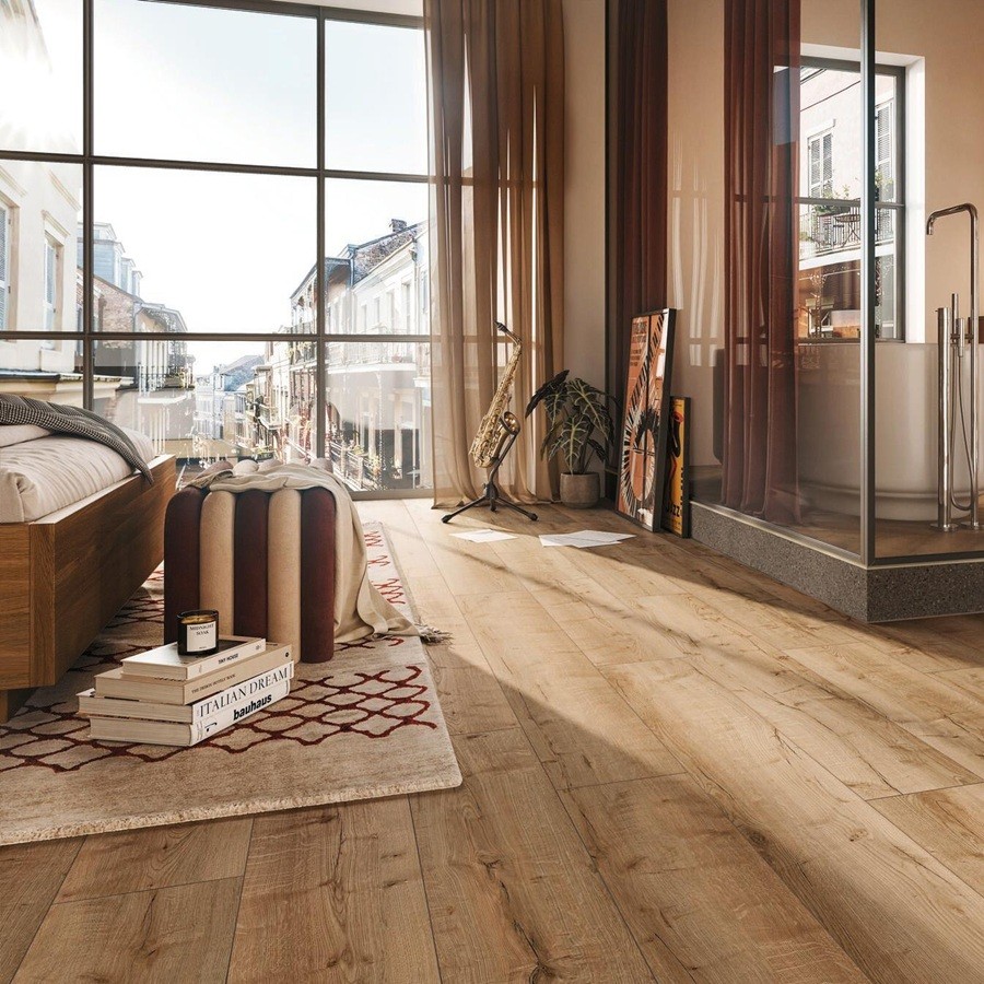 Wat direct opvalt, zijn de royale plankafmetingen van 1522 mm lengte en 225 mm breedte. De lange planken zorgen voor een ruimtelijk effect en een elegante uitstraling die een gevoel van luxe en verfijning toevoegt aan iedere kamer. De rondomlopende microvoeg (V-groef) accentueert iedere plank afzonderlijk, waardoor een realistisch en natuurlijk vloerbeeld ontstaat. De subtiele kleurnuances en lichte structuur versterken de klassieke uitstraling van de vloer en geven een warme, uitnodigende sfeer die in uiteenlopende interieurstijlen perfect tot zijn recht komt.
