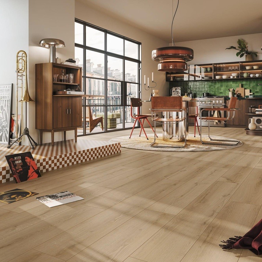 Wat direct opvalt, zijn de royale plankafmetingen van 1522 mm lengte en 225 mm breedte. De lange planken creëren een ruimtelijk effect en geven elke kamer een elegante, luxueuze uitstraling. Het rondomlopende microvoegprofiel (V-groef) accentueert iedere plank afzonderlijk en versterkt de realistische, natuurlijke uitstraling van de vloer. De warme, subtiele kleurnuances en lichte structuur versterken het karakter van de vloer en creëren een uitnodigende, harmonieuze sfeer die in uiteenlopende interieurstijlen perfect tot zijn recht komt, van modern en minimalistisch tot klassiek en Scandinavisch.
